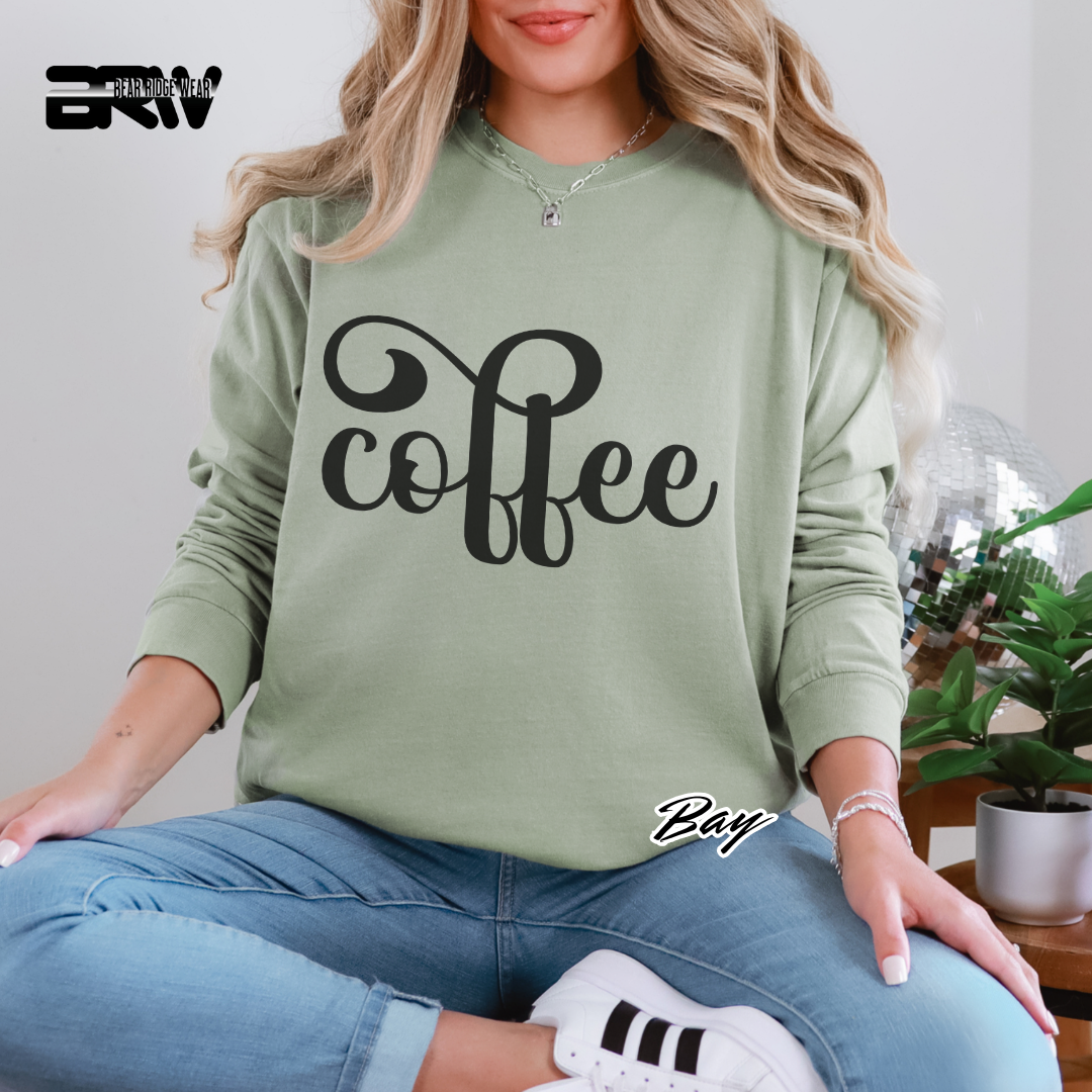 Fuel your day with style in this "Coffee" long-sleeve tee. The bold, striking lettering makes a statement, perfect for coffee lovers who want to wear their passion. Comfortable and casual, it's the ideal piece to pair with your favorite jeans or lounge in while enjoying your morning brew.