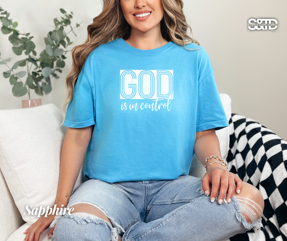 This women's Faith Tee boldly declares "GOD" in large, striking letters, emphasizing strength and faith. Below, the phrase "in control" is elegantly styled in italic cursive, adding a graceful touch that complements the powerful message. Crafted for comfort and inspiration, this white tee is perfect for women who want to wear their trust and confidence proudly every day.