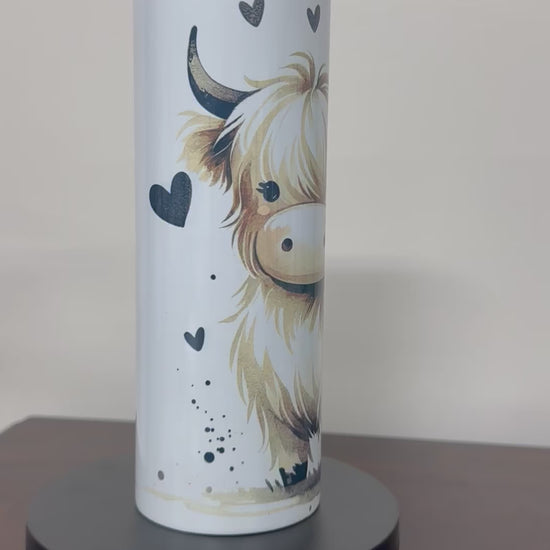 Introducing our 20 oz double wall slim tumbler with a charming highland cow and hearts design! Our insulated tumbler keeps your drink hot or cold while on the go. Say goodbye to messy spills with the included straw and straw cleaner. Perfect for anyone with a quirky sense of style.
