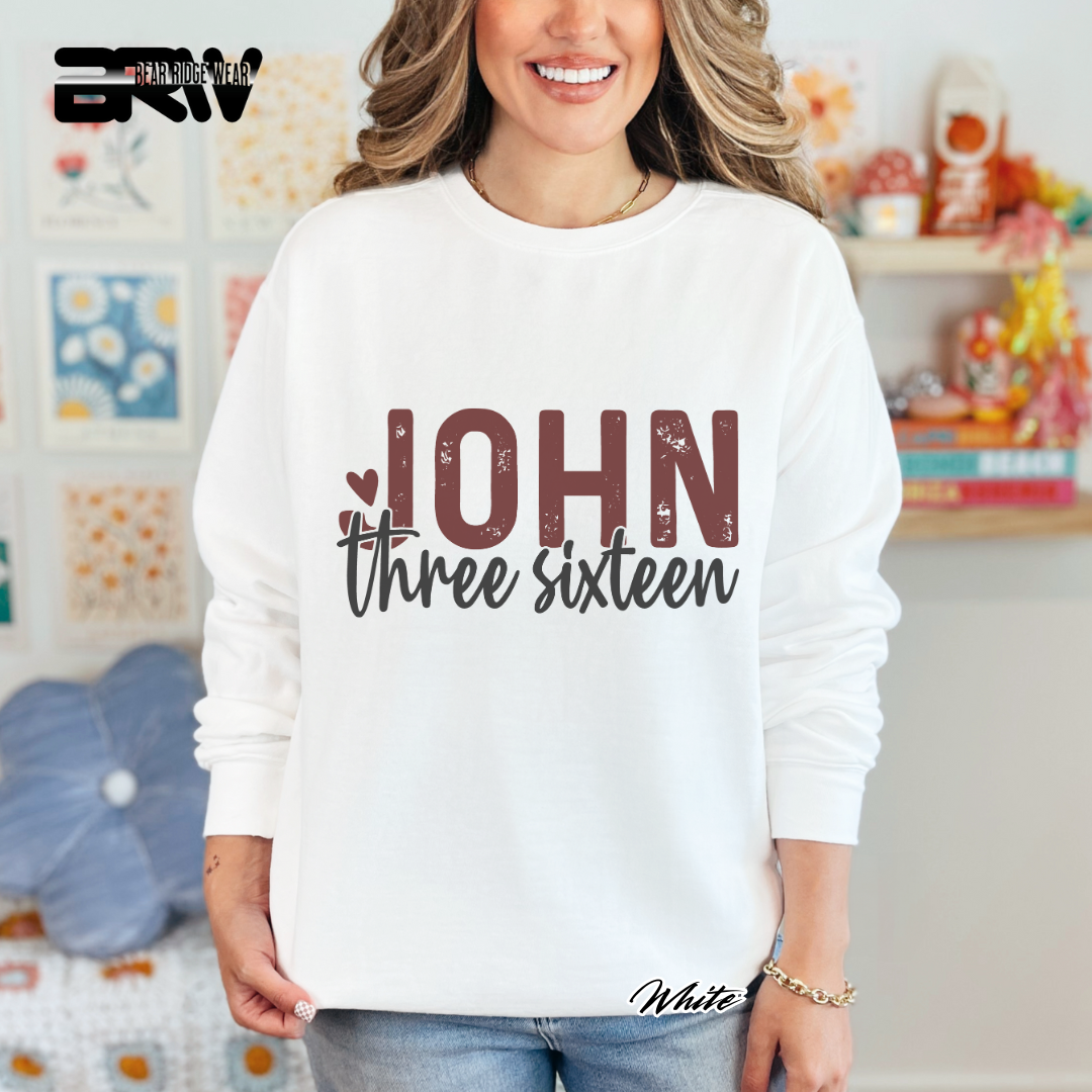 Get inspired and show off your faith with the 'John Three Sixteen' Crewneck Sweatshirt. This graphic tee for women features a powerful message and comfortable fit. Perfect for everyday wear or special occasions, this sweatshirt will keep you warm and stylish while spreading the message of faith.