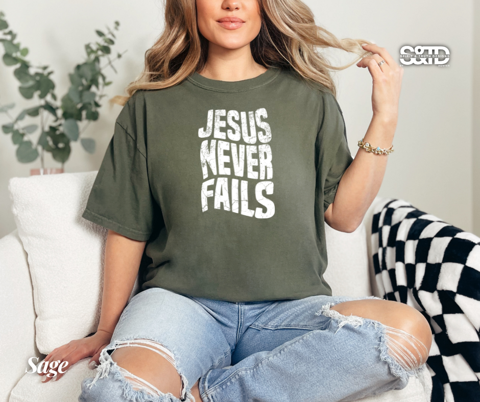 Embrace your faith with the Jesus Never Fails- Faith Tee designed specifically for women. Featuring a rugged stroke design in crisp white ink, this tee combines bold style with a powerful message of unwavering trust. Comfortable and flattering, it’s perfect for expressing your belief confidently every day. Let this tee remind you and those around you that no matter what life brings, Jesus never fails.