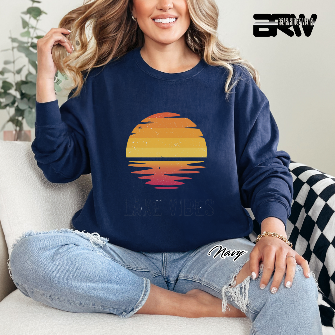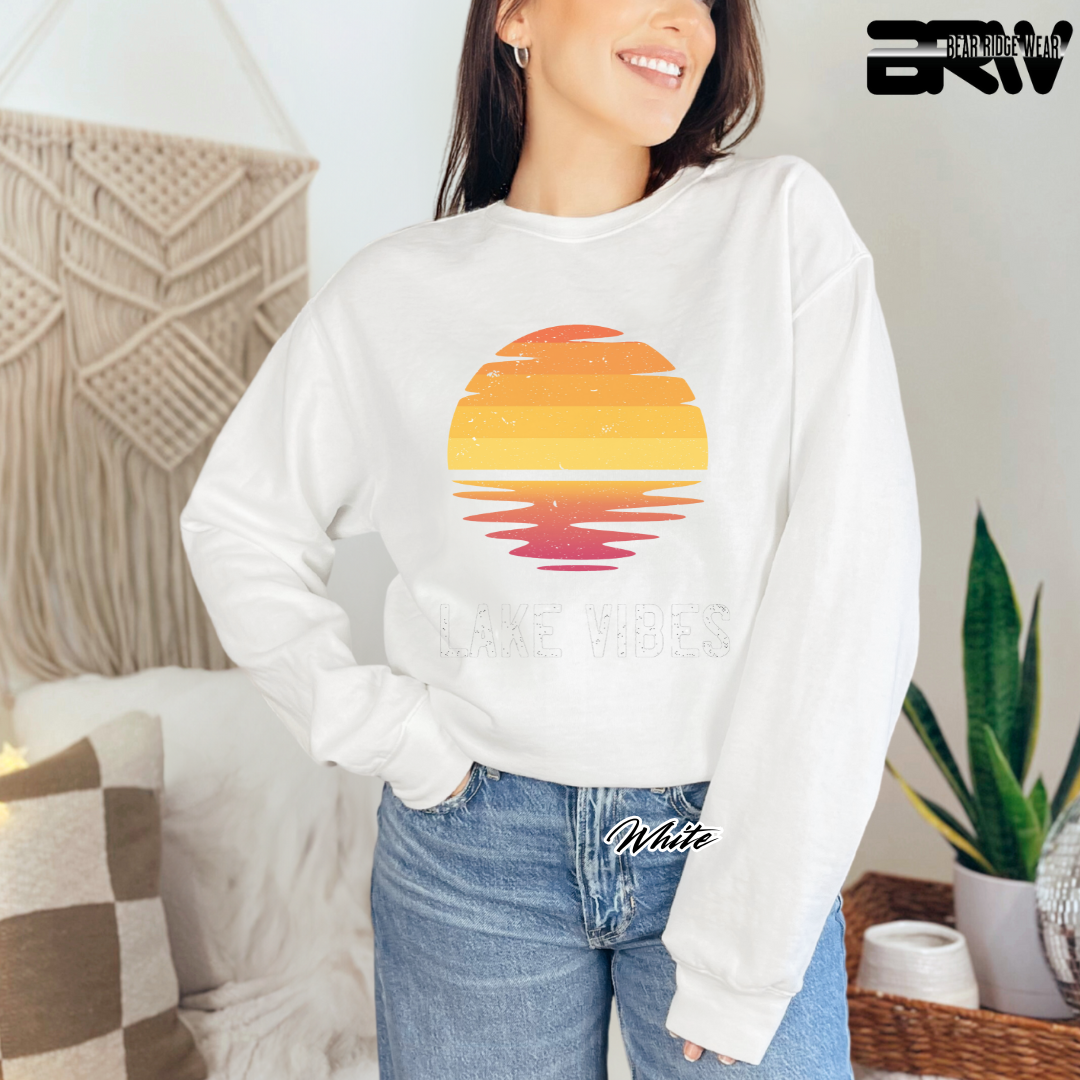Embrace the serenity of the water with the Lake Vibes Everyday Crewneck Sweatshirt. Featuring a stunning sunset and bold LAKE VIBES lettering, this cozy sweatshirt captures the warmth and relaxation of lake life. Perfect for breezy evenings and laid-back adventures.